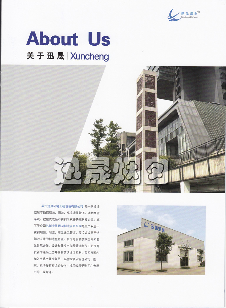 蘇州迅晟是一家專門生產(chǎn)設(shè)計(jì)銷售不銹鋼煙囪,不銹鋼雙層保溫?zé)焽?不銹鋼污衣井,不銹鋼油煙管的高科技企業(yè)。先后和多家國(guó)內(nèi)知名設(shè)計(jì)院合作,需要不銹鋼煙囪,不銹鋼雙層保溫?zé)焽?不銹鋼污衣井,不銹鋼油煙管等產(chǎn)品的請(qǐng)來(lái)電咨詢18862481813。